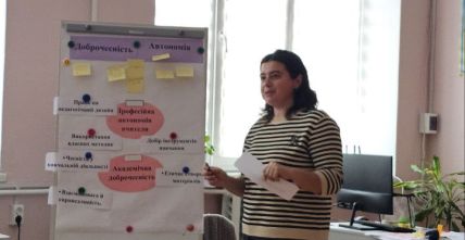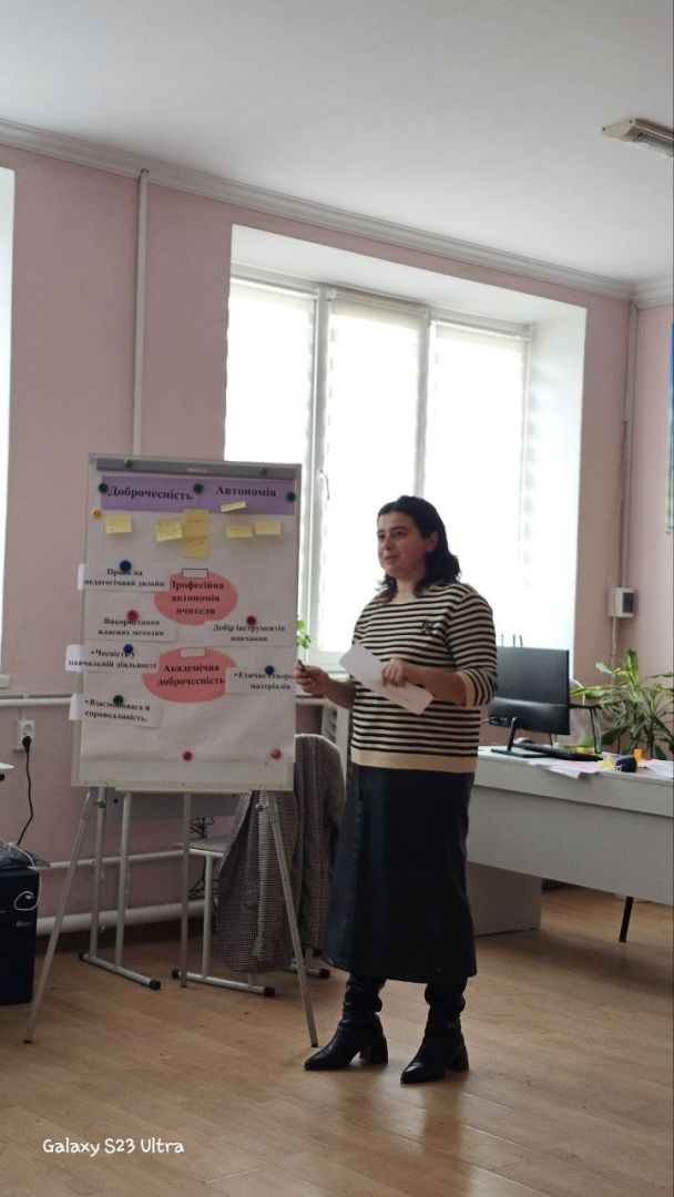 Під час тренінгу «Доброчесність як основа професійної автономії педагога» учасники виконували інтерактивні вправи, працювали з етичними кейсами, аналізували поведінкові дилеми й принципи формувального оцінювання. Одразу після цього відбувся круглий стіл «Доброчесний урок: реальні кейси та педагогічні стратегії». Педагоги обмінялися власними напрацюваннями, обговорили виклики сучасного закладу освіти та спільно напрацювали дієві механізми формування культури доброчесності в учнівських колективах.